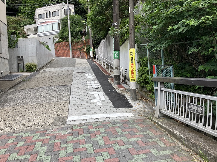 明神坂は長さが約150mほどのかなり急な坂です。坂上から西方向に下り、途中で南西方向に向きを変え、坂下では再び西方向に向かって丸子川に架かる明神橋まで急坂が下っています。坂名は、昔坂上に六所明神が祭られていたことに由来します。明治三十一年に神社を野毛二丁目に移転し、野毛の神社となり、六所明神が祭られていたことでこの社名が着きました。現在では、明神坂・明神池・明神橋・六所東などにその名称が残っています。