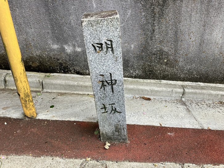 坂の途中の曲がり角に、坂名を記した石柱が建っています。