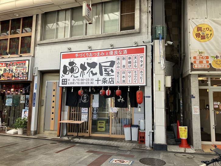 晩杯屋十条店は商店街の十条駅寄りのメインストリートから分岐した路地に面しています。店名の「晩杯屋」という文字が酔っ払っているようで、遠くからでもよく目立ちます。晩杯屋の開店時間は殆どの店舗が平日15時ですので、呑兵衛の姿はありません。