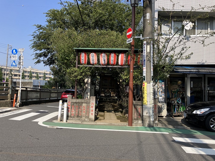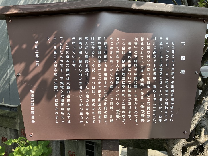 弥生町には江戸時代の川越往還が通っています。そのうち、大山町の境から当地までの街道沿いは上板橋宿となっていました。石神井川に架かる下頭橋は、寛政十年(1798年)に近隣の村々の協力を得ることで石橋に架け替えられています。境内にある「他力善根供養」の石碑はその時に建てられたものです。橋の名の由来については諸説があります。一つ目は、旅僧が地面に突き刺した榎の杖がやがて芽吹き大木に成長したという「逆榎」がこの地にあったという説。二つ目は、川越往還を利用する川越藩主が江戸に出府の際に、江戸屋敷の家臣がここまで来て出迎え頭を下げたからという説。三つ目は、橋のたもとで旅人から喜捨を受けていた六蔵の金をもとに石橋が架け替えられたからという説の三つが伝わっています。ここにある六蔵祠は六蔵の遺徳を讃えて建てられたのです。下頭橋と六蔵祠は昭和六十一年度に区記念物(史跡)に登録されました。