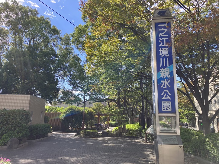 一之江境川親水公園は、一之江境川を利用した親水公園です。かつて一之江境川は東一之江村と西一之江村との間を流れ、用水路や船の運航路として利用されていました。多くの区民からの「自然に近い水辺を」という声に応え、平成七年(1995年)3月に、今井街道より上流が、翌年4月に下流が完成し、全長3.2キロメートルの親水公園が誕生しました。魚や昆虫や水生植物が生息できるように新中川の自然水を流しているため、ハゼ・スズキ・テナガエビなどが生息しています。夏季には水遊びが楽しめる広場が3か所設置してあり、豊かな自然を満喫することができます。また、ソメイヨシノ・クスノキ・サツキ・アジサイなど約2800本の樹木が植えられ、平成十八年には日本で初めての景観地区となりました。