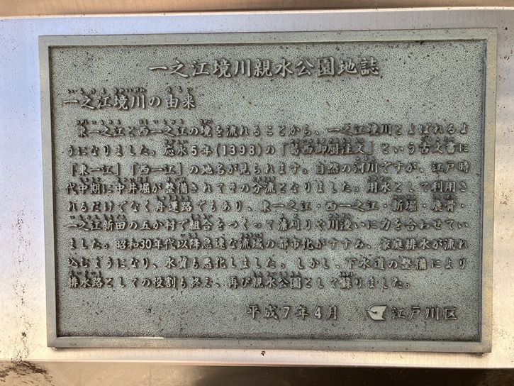 東一之江と西一之江の境を流れることから、一之江境川とよばれるようになりました。応永五年(1398年)の「葛西御厨注文」という古文書に「東一江」・「西一江」の地名が見られます。自然の河川ですが、江戸時代中期に中井堀が整備されてその分流となりました。用水として利用されるだけでなく舟運路でもあり、東一之江・西一之江・新堀・鹿骨・一之江新田の五か村で組合をつくって藻刈りや川浚いに力を合わせていました。昭和三十年代以降急速な流域の都市化がすすみ、家庭排水が流れ込むようになり、水質も悪化しました。しかし、下水道の整備により排水路としての役割も終え、再び親水公園として蘇りました。