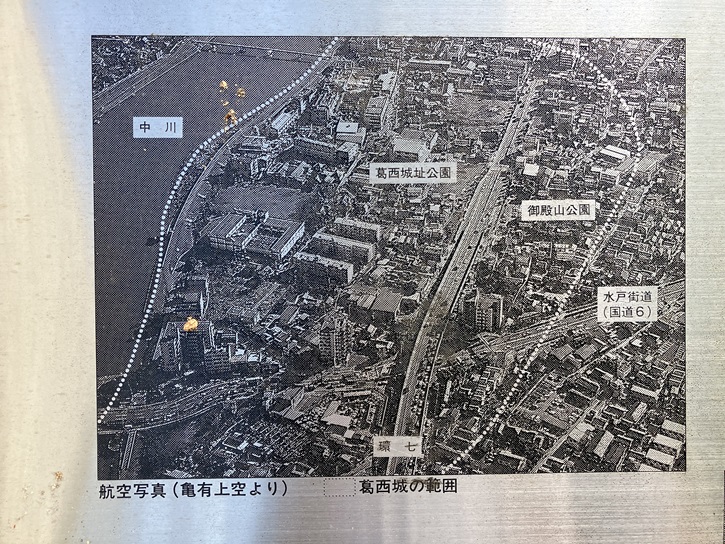 歴史と文化の散歩道の案内碑も建っています。航空写真から推測してみても、葛西城が如何に巨城であったかが分かります。