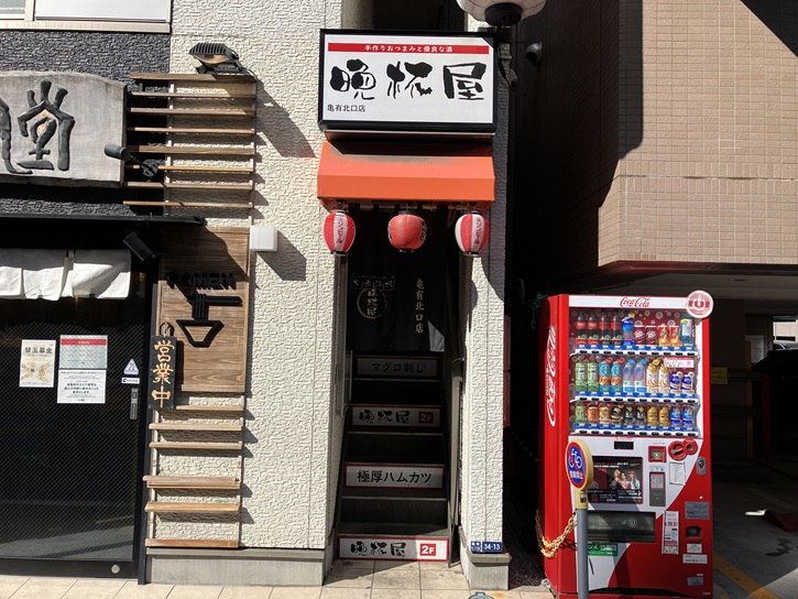 立ち呑み晩杯屋亀有北口店は、環七と高架で交差する常磐線の北側を左折し、亀有駅北口に通じる飲食店街の中ほどにあります。