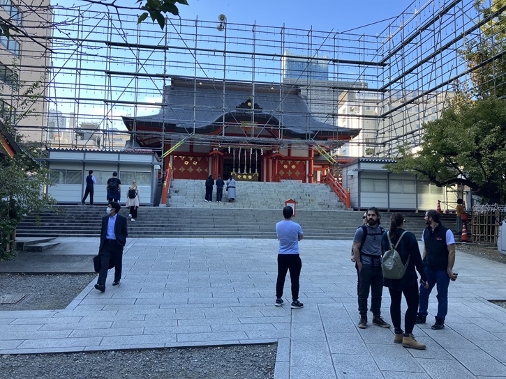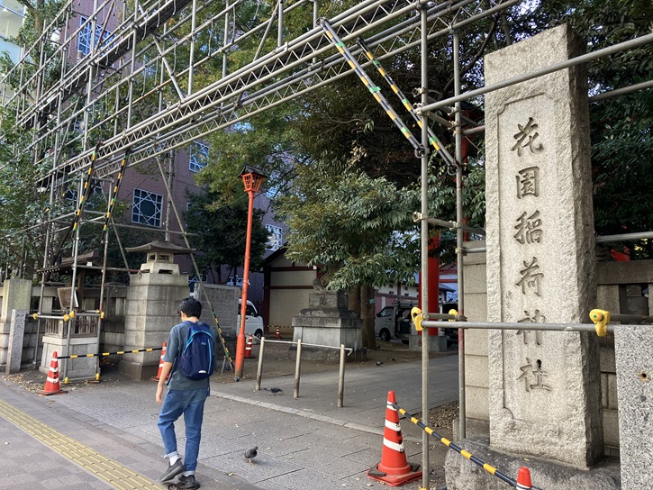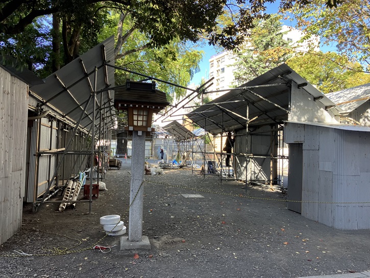 今は11月の酉の市の準備で大忙しです。11月11日(土)の一の酉・11月23日(木・祝)の二の酉では熊手を売る露店が出店し、「関東三大酉の市」に数えられるほどの賑わいになり、人出は60万人ともいわれます。花園神社名物の見世物小屋の興行もあります。また、1000灯以上という奉納の提灯も見どころです。境内では提灯を吊す木組みがあちこちで組み上がっています。