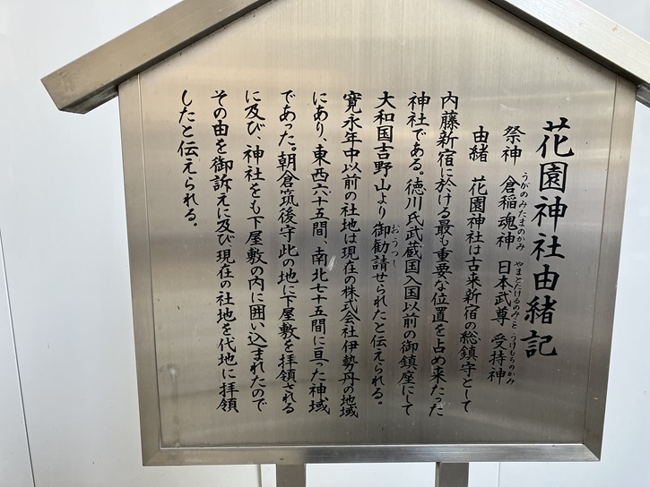- 花園神社は古来新宿の総鎮守として内藤新宿に於ける最も重要な位置を占め来たった(占めてきた?)神社である。徳川氏武蔵国入国以前の御鎮座にして大和国吉野山より御勧請せられたと伝えられる。寛永年中以前の社地は現在の株式会社伊勢丹の地域にあり、東西六十五間、南北七十五間に亘った神域であった。朝倉筑後守此の地に下屋敷を拝領されるに及び、神社をも下屋敷の内に囲い込まれたのでその由を御訴えに及び現在の社地を代地に拝領したと伝えられる。