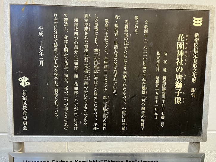 This is a pair of male-female bronze "Chinese lions" cast in Bunsei 4 (1821). They were donated to the shrine by Naito Shinjuku parishioners, and the names of those who
