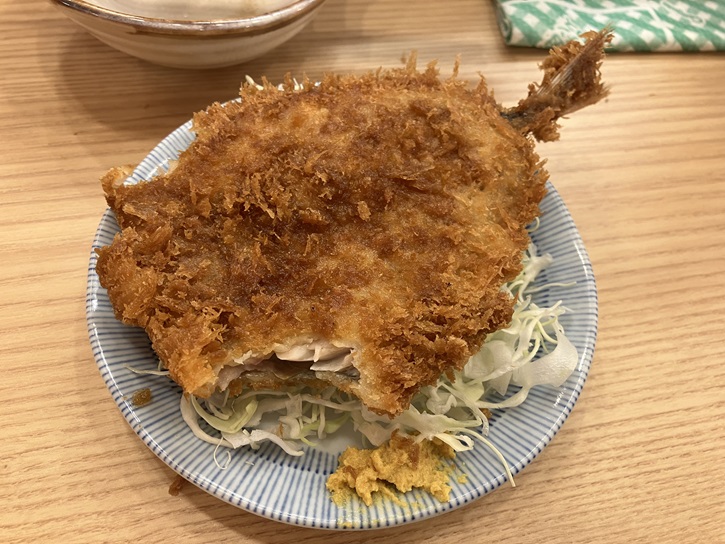 先ずは生ビール!500mlのジョッキは飲み応えがあります。お供は定番の煮込みです。気分が高揚してしまい、玉子入りにするのを忘れてしまいました。次に鰺フライです。大井町と同じ品になってしまいました。揚げたてはサクサクして超美味です。囓りかけでお見苦しいですが。