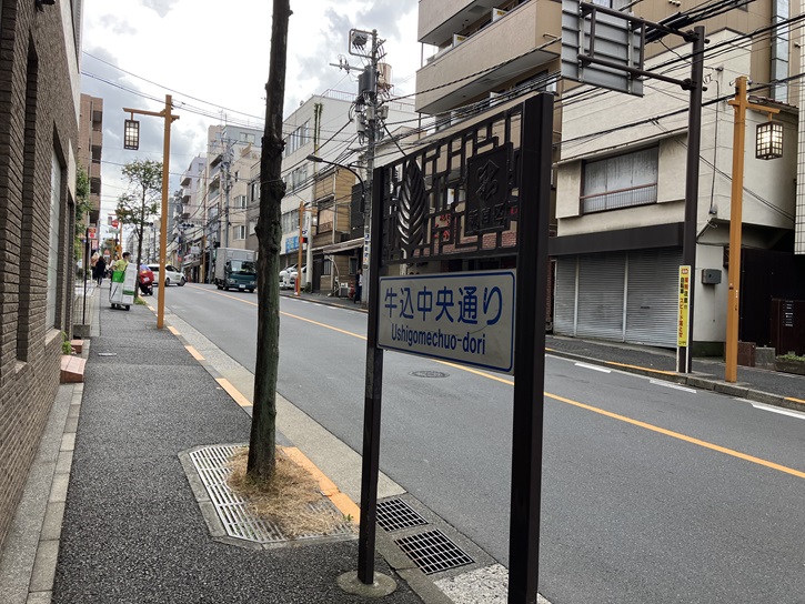 牛込北町交差点を左折して牛込中央通りに入ります。牛込中央通りは、牛込と呼ばれている地域のほぼ中央を南北に通る全長約1.2kmの道路で、明治・大正時代から様々な店が集まり、現在も数多くの魅力的な店が建ち並んでいる通りです。牛込の地名は、大宝元年(701年)に定められた大宝令(厩牧令)により各地に官牧が置かれ、武蔵国の官牧のひとつ「神崎牛牧」が現在の牛込辺りにあったことに由来するという説が有力です。牛込地域は、江戸時代には大名や旗本の住む武家屋敷が集中し、一方で町屋も少なからず形成され、古くからこの地に住む住民の多くがコミュニティ活動に参加しているのが特色です。狭い路地はほぼ江戸時代のままであり、また住居表示に伴う地名の改廃が他地域に比べて極めて少なかったため、江戸の雰囲気を感じ取ることができます。近代以降も、夏目漱石(父祖の代からこの地に居住)や尾崎紅葉を始めとする作家・文化人が数多く住みました。小石川と同様に、印刷や出版関係の会社も多く立地しています。
