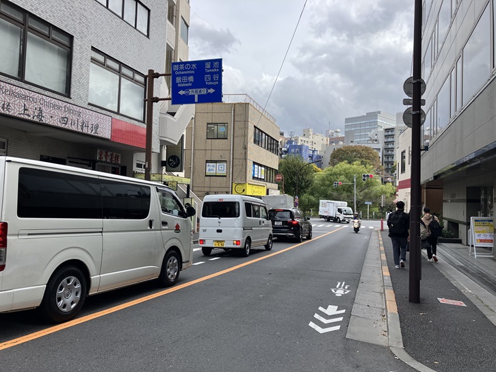 牛込中央通りは市ヶ谷田町交差点で外堀通りにぶつかって終点となります。交差点を右折して外堀通りを進みますと、市ヶ谷橋の先で外堀通りが分岐し、右手に進むと靖国通りに入ります(正確には、市ケ谷八幡町交差点から市谷見附交差点までは外堀通りと靖国通りが重なっています)