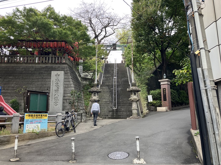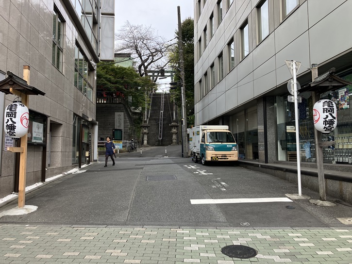 市ケ谷八幡町交差点から一歩入った先の高台に市谷亀岡八旛宮が鎮座しています。その右手には駿河台予備校市谷校舎があります。予備校とはいっても、伝統のある大学のような雰囲気です。市谷亀岡八幡神社の正面に聳える60段の急な石段は市谷八幡男坂です。長さは約30mほどですが、高低差は6mもあります。あまりの急階段なので、階段の途中に踊り場が設けられています。