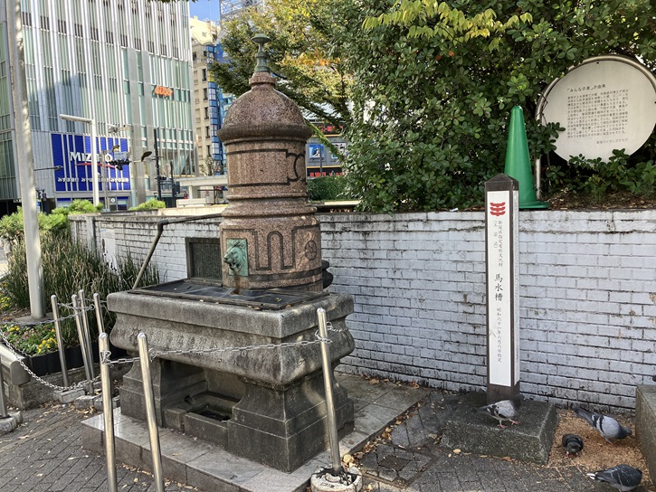 世界に3個しか現存していないといわれる珍しい馬水槽が新宿駅東口広場の隅にあります。馬水槽は馬車が全盛であった19世紀のヨーロッパで町の辻々に設けられ、馬や犬・猫などの水飲み場として使用されました。この赤花崗岩で造られた水槽は、前面の上部が馬用で下部が犬・猫用、その裏面は人間の水飲み場になっています。世界でも数少なく貴重な史跡として、新宿区指定文化財に選ばれています。東京の水道の“育ての親”である中島鋭司博士が明治三十四年頃に欧米諸国を視察した際、ロンドン市飲水泉及牛馬給水槽協会から東京市に寄贈されたものです。明治三十九年に東京市役所前(現在の東京国際フォーラム)に設置され、大正初期までは荷馬車を牽いた馬がこれを利用する光景も見られました。大正七年に麹町の東京市水道局守護門前に移され、関東大震災の被害を受けてからも各地を転々とし、昭和三十九年に現在地に設置されました。馬水槽が置かれた場所の名称は、一般公募の結果「みんなの泉」と名づけられました。