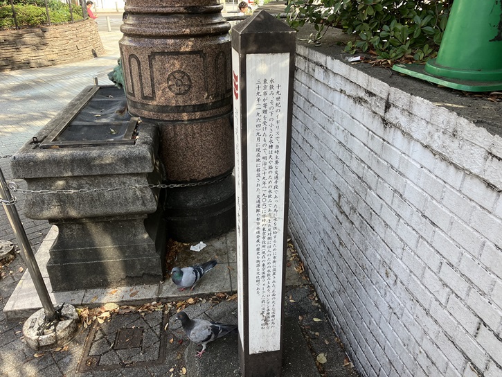 十九世紀のイギリスで、当時主要な交通手段であった馬に水を供給するために市街に設置された。正面の大きな水槽が馬の水飲み、その下の小さな水槽は犬や猫のための水飲みである。また反対側には人のための水飲みもある。ロンドン水槽協会から東京市が寄贈を受けたもので、明治三十九年(1906年)に当時の東京市役所(現在の東京国際フォーラム)前に設置され、昭和三十九年(1964年)九月に現在地に移設された。交通運搬や都市水道発展の歴史を物語る文化財である。