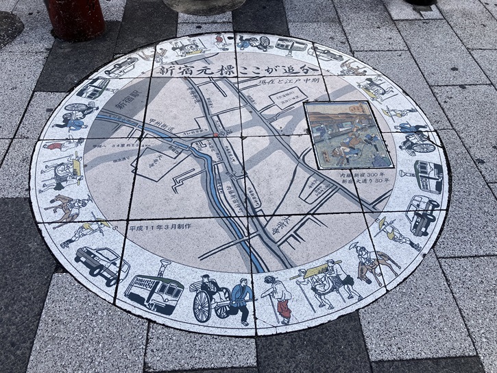 歩道の角には、現在と江戸中期時代の地図が描かれたタイルがはめ込まれています。