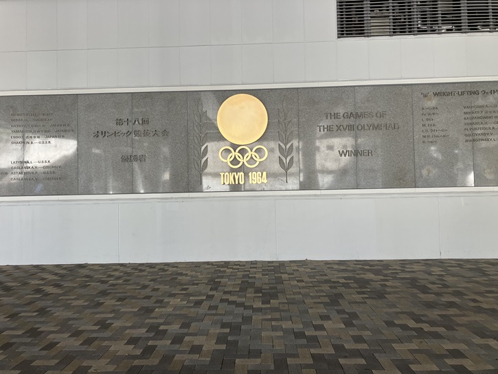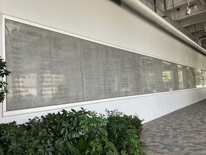 今まで気が付かなかったのですが、競技場の1階の壁に1964年に開催された第十八回東京オリンピック競技大会の優勝者を記した巨大なプレートが掲げられています。マラソンの優勝者はエチオペアのアベベでしたね。