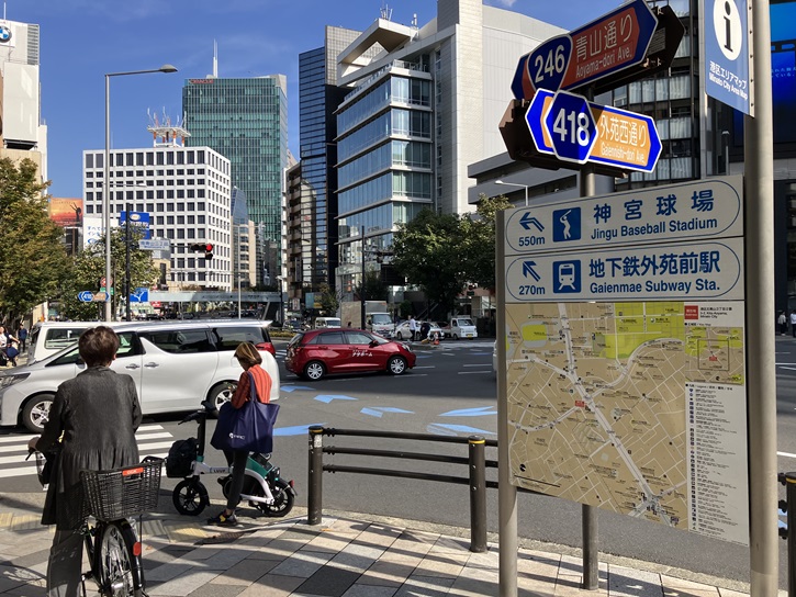 南青山三丁目交差点で右折し、国道246号青山通りを渋谷方向に進みます。