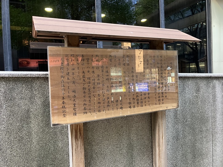 ここは、明治三年四月十七日、明治天皇駒場野の練兵場天覧御幸の際、御往復供、当御嶽神社拝殿を御座所に当てられ、御小休所となった所であります。当日は、午前五時御乗馬にて、皇居を御出発され、外桜田より赤坂をお通りになり、吉井友謹邸で御小休、更に御板輿に御移乗になり、当御嶽神社に於て再び御小休、御召換になり、御乗馬にて騎馬野練兵場に向われました。午前八時駒場野御着、午前九時燈火(花火)一発を合図に、練兵を御覧になり午後三時に終了致しました。午後四時、号砲一声還御となり、前軍より次第に列を進められ、御嶽神社・吉井邸にて各々御小休され、午後六時還幸になりました。翌十八日、明治天皇の思召により、当神社に鳥居及び駒寄せの御奉納がありました。昭和十四年二月、明治天皇聖蹟記念碑を建立しました。
