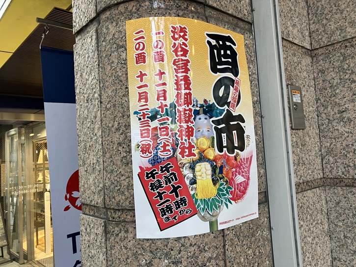 酉の市では、御嶽神社境内に神社熊手・商人熊手の市が立ちます。また、門前の宮益坂には屋台が立ち並びます。