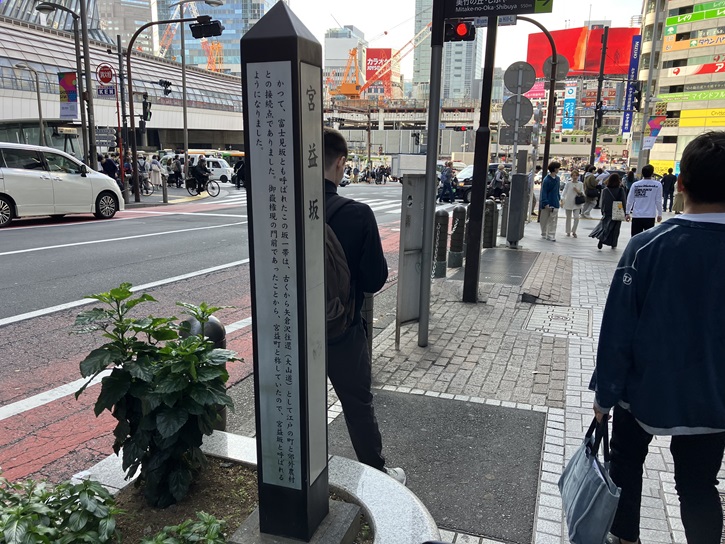 かつて、富士見坂とも呼ばれたこの坂一帯は、古くから矢倉沢往還(大山道)として江戸の町と郊外農村との接続点でありました。御嶽権現の門前であったことから、宮益坂と呼ばれるようになりました。