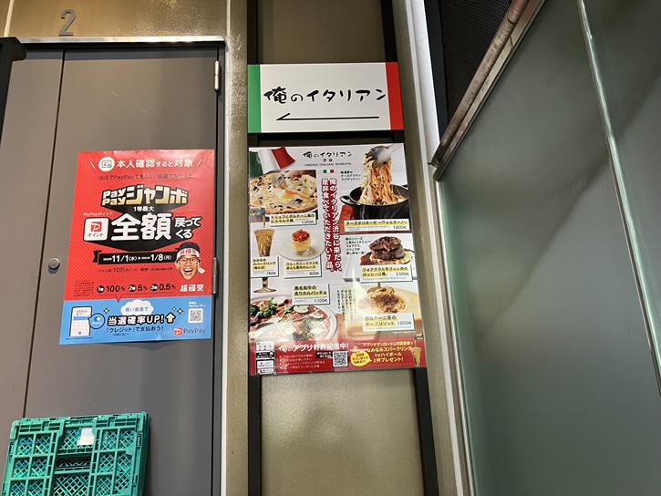 俺のイタリアン渋谷店は2階にあり、階段でもエレべーターでも行けます。エレべーターで行きますと、直接店内に入れます。階段で上がるとドアを開けて入る形になります。