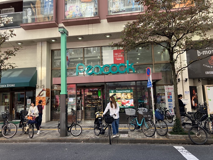 「とよかつ」の道路を挟んだ向かいにピーコックストア恵比寿店があります。今はイオン系のスーパーになり、2階にはダイソーが入っています。ちなみに、ピーコックストア恵比寿店の場所には、かって本庄映画館があり、映画館が閉館した後にボーリング場になり、その跡地にピーコックストアが出来たとのことです。私もよくお買い物をしましたね。