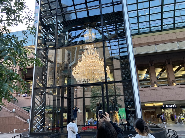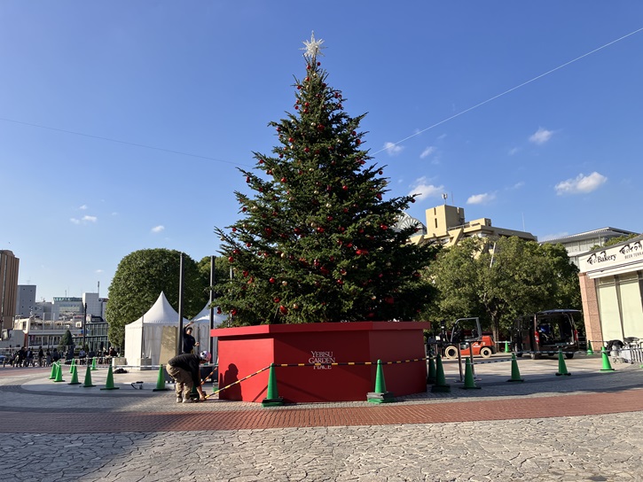 現在はクリスマスに向けて様々な準備がされています。時計広場では4年ぶりにクリスマスツリーが復活します。全長約10mのビッグツリーには、赤を基調とした300個以上のオーナメント(クリスマスツリーに付ける飾り)を装飾し、シャンパンゴールドを基調とした約10万球の光とともに恵比寿ガーデンプレイスで過ごす特別なクリスマスを華やかに演出します。センター広場ではバカラのシャンデリアが灯っています。正式には今日11月11日に点灯式が行なわれますので試験点灯ですが。