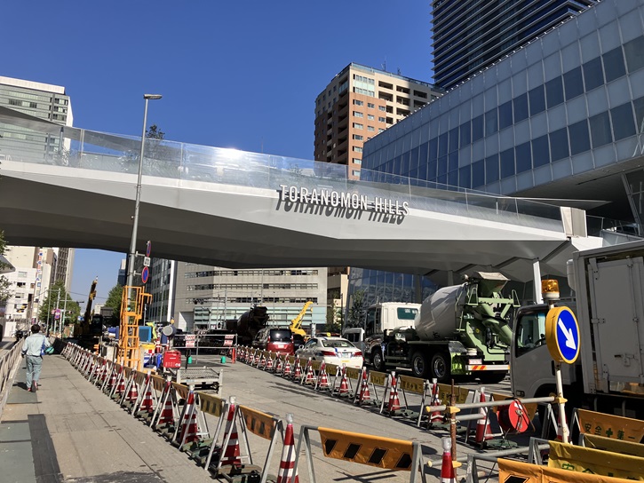 虎ノ門ヒルズと虎ノ門ヒルズステーションタワーを結ぶ連絡通路も設置されています。「TORANOMON HILLS」のロゴが、どこか六本木交差点の高速道路の高架に架かってあるものと似ていますね。