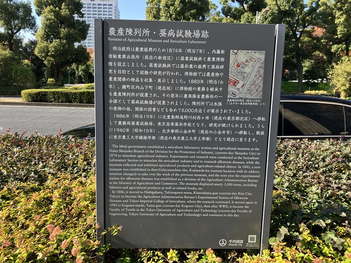 明治政府は農業振興のため明治七年(1874年)、内藤新宿勧業察出張所(現在の新宿区)に蚕業試験掛と農業博物館を設立しました。蚕業試験掛では蚕糸業の振興と蚕病研究を目的として試験や研究が行われ、博物館では農産物や農業関係の物品を収集・展示しました。明治十六年(1883年)、麹町区内山下町(現在地)に博物館の業務を継承する農産陳列所が設置され、その翌年に農商務省農務局の一分課として蚕病試験場が設置されました。陳列所では水陸の産物の他、関係の図書なども含めて5、000点近くが展示されていました。明治十九年(1886年)に北豊島郡滝野川村西ヶ原(現在の東京都北区)へ移転して農務局蚕業試験場、東京高等蚕糸学校となり、研究が続けられました。さらに昭和十五年(1940年)、北多摩郡小金井町(現在の小金井市)へ移転し、戦後に東京農工大学繊維学部(現在の東京農工大学工学部)となり現在に至ります。