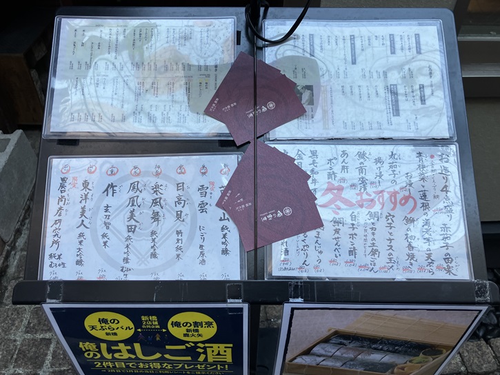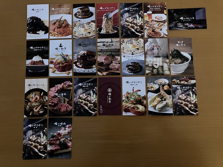 俺の割烹銀座本店だけだと思うのですが、エレベータの横に「俺の〜」のシリーズ全店のカードが並べられていました。あまりに種類が多かったので何枚か取り漏らしたようですが、今までに巡ったお店の殆どのカードをゲットしました。これは私のお宝になりそうです。