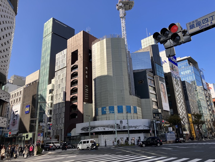 中央通りを銀座四丁目交差点まで進みます。銀座四丁目交差点は、銀座のランドマークである和光本館と三愛ドリームセンターと三越デパートと銀座プレイスが向かい合い、正に銀座の中心です。その一角を占める三愛ドリームセンターは、昭和三十八年(1963年)に開館したガラス張りで円筒形が特徴的な建物で、平成十五年(2003年)には日本におけるモダン・ムーブメントの建築」にも選ばれました。三愛ドリームセンターは、リコーの創業者である市村清の「豊かな未来をこの銀座から発信する」という強い想いを継承し、さまざまな用途で活用されてきました。しかし、建物は今年で60年が経過し、老朽化が進んでいます。人通りの多い銀座四丁目交差点に面しているため、安全面での懸念から建て替えが決まりました。現在は建物の解体工事が行なわれているようですが、新しい建物は令和九年(2027年)に竣工予定とのことです。工事用の囲いパネルには巨大な絵が描かれています。