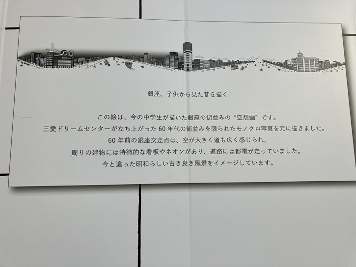 この絵は、今の中学生が描いた銀座の街並みの“空想画”です。三愛ドリームセンターが立ち上がった60年代の街並みを限られたモノクロ写真を元に描きました。60年前の銀座交差点は、空が大きく道も広く感じられ、周りの建物には特徴的な看板やネオンがあり、道路には都電が走っていました。今と違った昭和らしい古き良き風景をイメージしています。