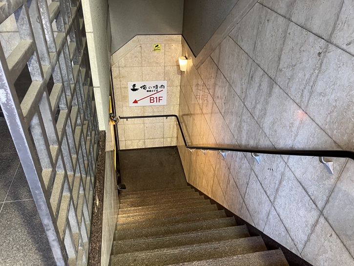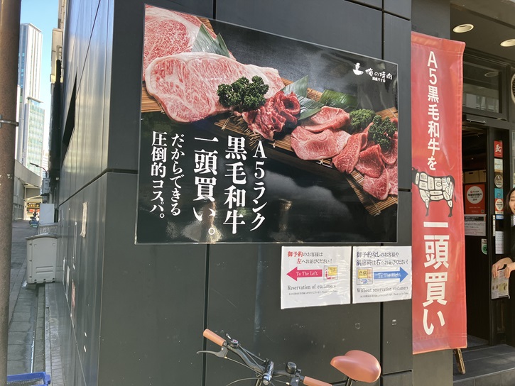 「俺の焼肉銀座九丁目」は、難波橋交差点から高速道路の高架を越えた先の広い道路に面したビルの1階にあります。高速道路の高架下ではありませんので、明らかに「銀座九丁目」を冠するには無理があります。