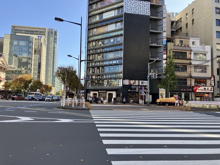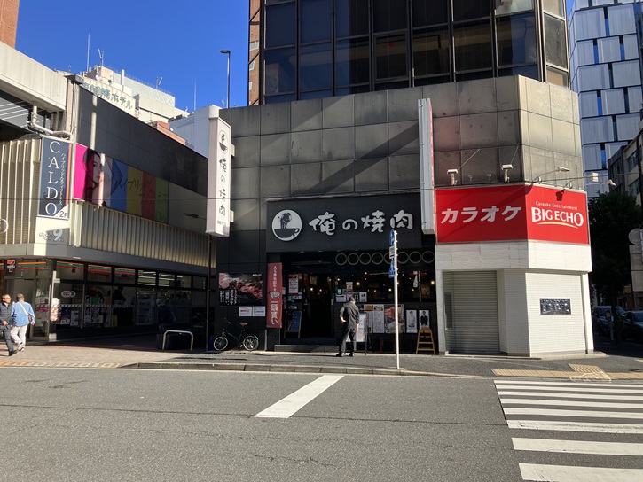 三越デパートの角で左折して晴海通りを東銀座方向に向かいます。三原橋交差点で晴海通りは昭和通りと交差します。その北側の角に「俺の焼肉銀座四丁目」のお店があります。