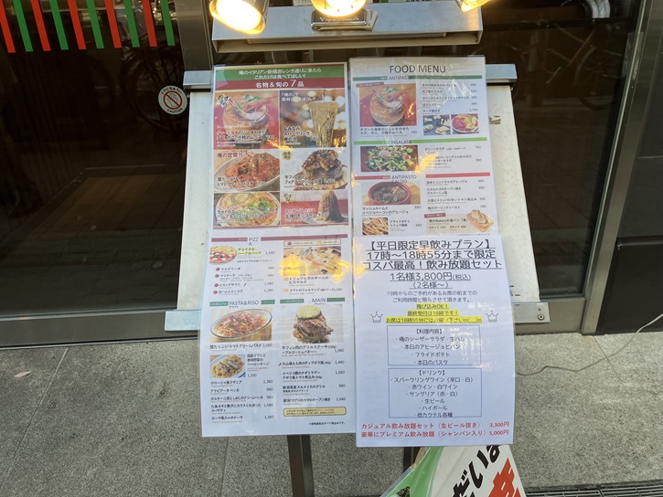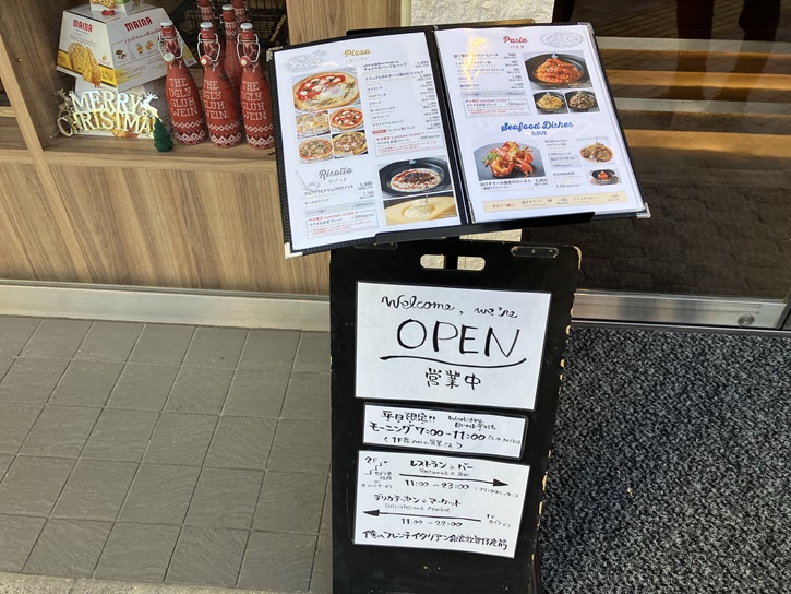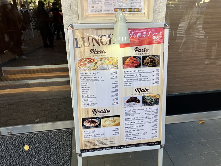 メニュー表には、定番のパスタやピザの他に、一品もののお料理も載っています。今はお昼を過ぎた時間帯ですが、ランチも営業中です。ワインは飲めるのかな?