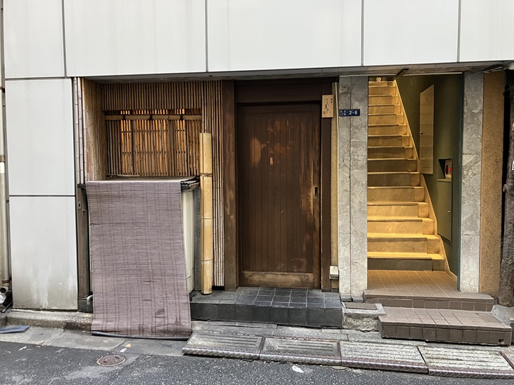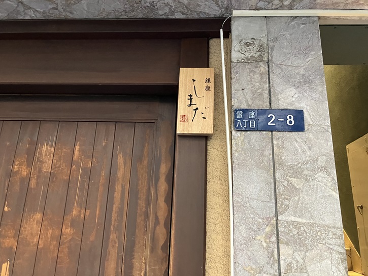 これまた古ぼけたドアの前まで進んで、やっとこれが「銀座しまだ」のお店だと分かりました。店内は見えませんが、立ち席が10席、テーブル席は1卓(4人掛)のこじんまりとしたお店だそうです。まさに隠れ家的日本料理店ですね。