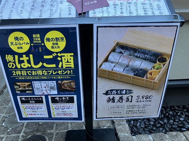 店名との繋がりは不明ですが、「俺の割烹新橋鹿火矢」はお茶漬け専門のお店です。といっても、割烹の名が冠されていることもあり、お造り・揚げ物・すき焼きなどのメニューも揃っています。鯖寿司はお持ち帰りもできるみたいです。酔っ払って帰っても、鯖寿司を見せれば奥さんも機嫌を直されることでしょう。最後のシメはお茶漬けを頂くといった感じでしょうか。