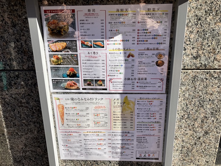 ランチタイムには、ラー油の効いたピリ辛のお出汁に噛み応えのあるそばをボリュームたっぷりに盛った俺のスタイルのG系そばが提供されます(「G系」とは、「ラーメン二郎インスパイア系」の意味です)。ディナータイムには、さまざまな天ぷらやおつまみ各種と日本酒が楽しめます。
