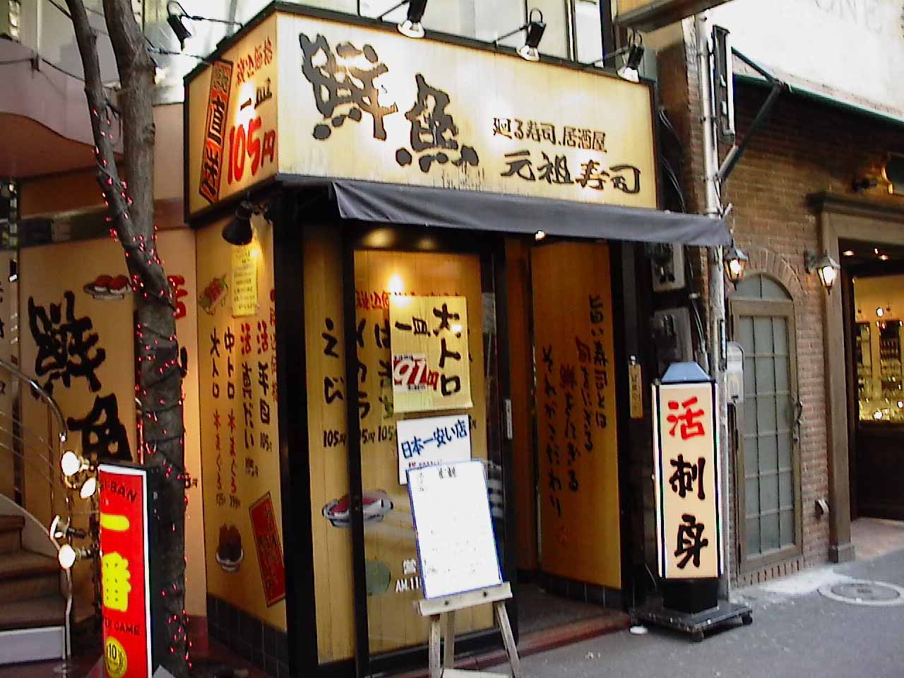 区役所で手続きを済ませたら、もう1時過ぎになっていました。もうお散歩は無理な時間です。よぴっ、久し振りに渋谷でお寿司でも食べましょう!山手線で渋谷駅に行きます。念のため、ハチ公前の広場で万歩計をリセットします。時刻は1時半過ぎです。109の方向に道玄坂を歩き出します。日本中にお寿司屋さんは何万軒もあると思いますが、回転寿司の中では日本一安いと私が太鼓判を押すのが渋谷の文化村通りから路地に入ったこの(↓)お店です。偶然見つけたのですが、私の回転寿司遍歴の中でも一番のイチ押しのお店です。なんてったって安い!ネタがデカイ!種類が豊富!磯汁がウマイ!マグロ2貫1皿で95円は破格っつうの!あんまり他の人には教えたくないんすけど。。。