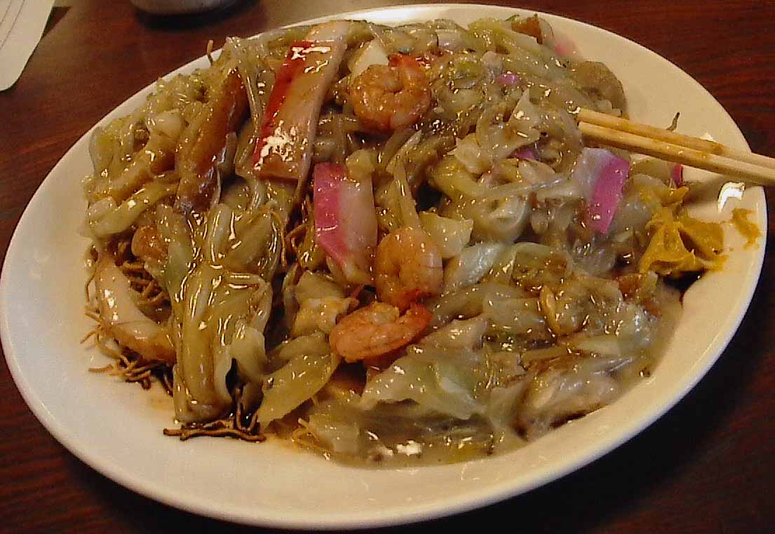 お店に入りますと、午後の中途半端な時間ということもあって、お客さんはだれもいません。テーブルにつき、『皿うどんを下さいな!』と言いますと、『細麺になさいますか、太麺になさいますか?』と訊かれます。そうなんです、普通は揚げた細い麺の上に具をのせるのですが、チャンポンに使う太い麺を使った皿うどんも美味しいのです。頭の中ではそう思ったものの、口では『細麺でお願いしますぅ。。。』と言ってしまいました。どちらも美味しいのですけど、関東では珍しい太面にすれば良かったと後悔します。本場と同じく、蒲鉾・竹輪・アサリ・海老・白菜などの具がたっぷりのった皿うどんは美味でした。辛子とソースの量が多かったせいか、食べ終わった後で喉が渇きます。今更ビールを飲むわけにもいきませんので、お茶で喉の渇きを癒します。あ〜〜〜、美味しかった!ちなみに、『吉宗』は『ヨシムネ』ではなく『ヨッソウ』と読みます。長崎では『茶碗蒸しは吉宗、カステラは福砂屋』が定番なのです。