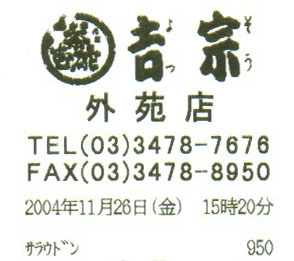 国立競技場に沿って神宮外苑の中に入ります。広場の入り口には『御鷹の松』なる古木が植えられています。何でも、三代将軍徳川家光が鷹狩りの途中で後に国立競技場の敷地となった鏡妙寺で休息していたところ、江戸城より愛鷹「遊女」が飛来し、境内前庭の松に止まったとのだそうです。家光はこれを大いに喜び、この松を「遊女の松」と名付けたとか。それで『御鷹の松』と称されるようになったのだそうです。同じ敷地には俗名で『なんじゃもんじゃの木』というのもあります。なるほど、『歴史と文化の散歩道』には面白い発見がありますね。広大な敷地の絵画館の前を通りますと、あちこちに年配の方のグループが見えます。ちょうどイチョウ祭りがあっているとかで、イチョウ並木を見物がてらお散歩されているのでしょうか?児童遊園のところを左折しますと、直ぐに信濃町駅に着きます。そのまま通り過ぎようとしましたら、『吉宗』の文字が目に止まります。長崎では『茶碗蒸し』の元祖として有名な老舗です。ランチメニューはありませんが、本場のちゃんぽんとか皿うどんがあります。久し振りに味わってみますかね。。。