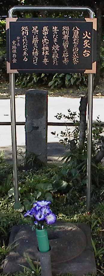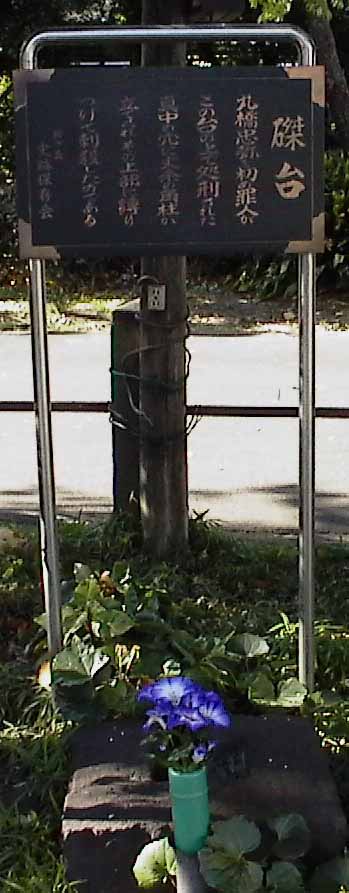 旧東海道は大井町に入ると、さすがに商店街も途切れます。立会川に架かる浜川橋に着いたのは12時過ぎでした。万歩計は5、698歩を示しています。ここで『品川宿場散歩』は終わりとなります。ここから『品川池上コース』は、馬込を経て池上駅に至るコースと、京浜運河を越えて大井埠頭中央海浜公園を巡るコースとに分岐します。未だ時間がありますので、長い距離の『馬込文士村散歩』を歩くことにします。旧東海道はまだ続きます。暫く歩きますと、旧東海道は鈴が森で第一京浜と合流します。鈴が森といえば、北の小塚原と並んで江戸時代の刑場として知られています。小塚原の刑場跡は『千住コース』で立ち寄ったのですが、小塚原回向院と延命寺に碑文が残る程度で、当時の資料はあまり残っていませんでした。鈴が森刑場跡にも大経寺というお寺があって、鈴が森刑場で処刑された人たちの供養をしているそうですが、お寺と同じ敷地に供養塔やお墓と共に当時の磔の台座や火炙りの台座が残っています。何となくギョッとするものですが、実際に処刑に使われたものだと思うと磔や火炙りにされた罪人の苦しみが伝わってきます。ちなみに、ここで処刑されたのは、丸橋忠弥・白井権八・八百屋お七・白木屋お駒などだそうです。