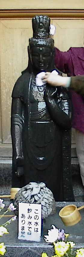 コースの案内を読み返していましたら、染井霊園の近くにある慈眼寺というお寺に芥川龍之介・谷崎潤一郎のお墓があるとか。これ以上時間を費やせませんので、お墓めぐりは諦めることにします。染井霊園から白山通り(中山道)を隔てた反対側に、とげぬき地蔵で有名な高岩寺があります。境内の隅にある洗い観音は、患部と同じ場所をこすると病が治るといわれています。以前はこするのにタワシが使われていたそうですが、お参りの人がタワシであまりに力を入れて洗ったために摩滅し、現在は二代目を白い布で洗うようになったそうです。いつも行列が絶えませんが、私も並んで水だけかけました。タオルを使うと服が濡れそうでしたので。。。これでご利益はあるのでしょうか?