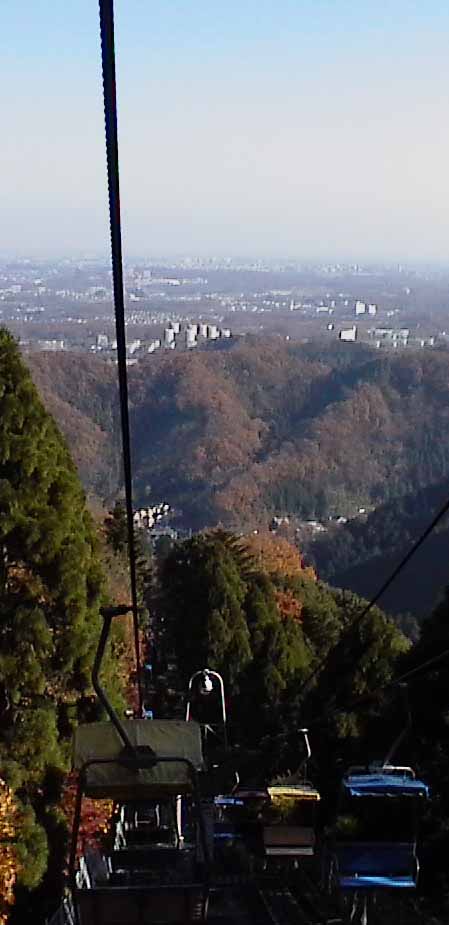お店の先には広場があって、その先にはケーブルカーとリフトの乗り場があります。遊びに来たわけではありませんので、そのまま引き返そうかと思いましたが、折角きたのだから。。。と強気の虫が誘います。しょうがない、急いで往復することにします。ケーブルカーに乗ろうと時刻表を確かめますと、20分後の出発になっています。そんなに時間を無駄にしたくないので、リフトの様子を訊いてみますと、何時でも乗れるとのこと。じゃあ、リフトにしましょう!往復のチケットを買います。ナント、900円!これじゃ、ランチは抜きですね。。。リフトの乗り場は急な石段を登った先にあります。平地を歩くのはまだしも、階段は足腰に堪えます。ヒ〜ヒ〜言いながら、ようやっとリフトの乗り場に辿り着きました。高尾山のリフトは2人乗りで、長椅子がブランコのようにぶら下がっているだけです。安全ベルトも何もありません。片手にビデオカメラを持ち、反対側の手で手すりを握り締めます。係りのおじさんに助けられてリフトに腰を下ろします。リフトはゆっくりと登りはじめました。ゴトンゴトンと軋み、ゆらゆら揺れながら。。。