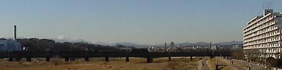 早いもので、この間お正月を迎えたと思っていたら今日は1月13日。格別生活に変化がないせいか、毎日があっという間に過ぎていきます。今日も朝からいいお天気ですね!冬晴れで風のない日はお散歩に絶好の日和です。一昨日歩いた『二子・是政コース』の続きを歩くことにします。コースが家から大分離れてきましたので、起点となる府中市の是政橋に行くのも一苦労です。山手線・中央線を乗り継いで、武蔵境駅で西武多摩湖線に乗り換えます。終点の是政駅から5分ほど歩いて是政橋の袂に辿り着きました。割と早めに家を出たのですが、時刻はもう11時36分になっています。万歩計をリセットして昭島市の多摩大橋を目指します。空は真っ青に澄み渡り、雲ひとつ見えません。遥か前方には山々の峰が連なり、その真ん中に雪を頂いた富士山が顔をのぞかせています。土手沿いには多摩川を見下ろすように大きなマンションが建ち並んでいます。南向きで太陽を遮るものは何もないし、西を向けば富士山が拝めるしで、退職後に住むには最高の場所です。