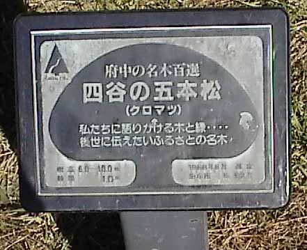 この松は、江戸から明治・大正にかけて水防林として植林されたもので、以前から『下堰の松』と称され、長く地域の人々に親しまれてきました。その後、大正の初めに護岸工事のために四つ谷村で今も『中隠居』と呼ばれている市川家から国に無償で提供され、大切に保護されてきました。このような長い歴史的変遷の中で、次のような話も生まれてきました。それは甲州商人と四つ谷村民との心温まる美談です。江戸時代の中頃、甲州の商人が病で倒れているのを村民が助け、半年余り玉川寺で手厚い看護をし、病が癒え、その後商人は甲州で財を成しました。この四つ谷村の恩徳に報いるために、商人は一尺五寸の木像を寺に奉納し、また多摩川堤に松を植えたと言われています。その松も次第に少なくなり、今の本数となって『五本松』と呼ばれるようになりました。長い間の多摩川の変遷と自然の歴史、人の流れを見続け、風雪に耐えてきた松で、特に四つ谷村民の深い情けを末永く府中市民が引継ぎ、この松をシンボルとして保存したいと思います。