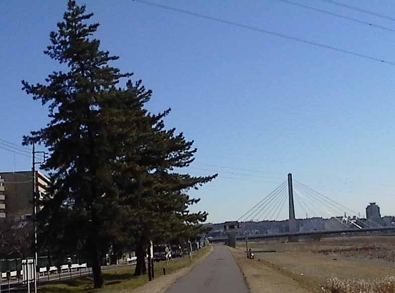少し歩きますと、京王線の鉄橋に出ます。電車に乗っている時にはまさかここを歩くとは思いもしませんでしたが。。。鉄橋を越えて更に歩きます。多摩川の向きが北よりになって、太陽が背後に回ります。前方に美しい形をした橋が見えてきました。府中四谷橋といいますが、これも是政橋と同じく鋼斜張橋のようで、真っ青な空にピンと伸びた鋼線が印象的です。この府中四谷橋の直ぐ先に見事な枝振りの大きな松の木が立っています。『四谷の五本松』というのだそうです。