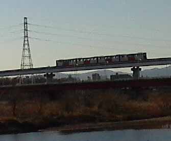 人家を縫って更に歩きますと、立川公園に出ます。公園と下水処理場の間の小さな橋を渡って、再び河川敷に出ました。遊歩道の上には日野橋が架かっています。更に歩いて行きますと、前方に見慣れぬ形の電車が走っています。何だろうとよくよく見ますと、多摩都市モノレールでした。地面よりかなり高いところを走っていますので、さぞや眺めがよいことでしょう。モノレールも通る立日橋を越えますと、多摩川緑地の先に中央本線の鉄橋が見えてきます。新宿や中野の繁華街を通ってきた中央線ですが、このあたりになるとローカル線のような長閑な感じです。