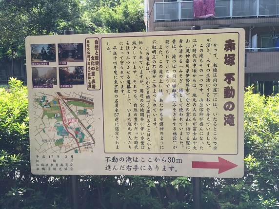 かつて、板橋区内にある崖下からは、いたるところで湧水がみられ、人々の生活に潤いをあたえてくれていた。この滝もその一つで、山岳信仰が盛んとなった江戸時代の中ごろより、富士山・大山(神奈川県相模原)などの霊山に発拝する際、出発に先だち地元の人たちがここで身を清める“みそぎ”場として使われていた。崖上にはこの滝の守護神ともいえる不動尊石像が祀られている。昔は滝つぼの前に垢離(こり)堂が設けられていたという。昭和八年滝つぼが整理される前には、現在より水量も多く水の落ち口も広かったようである。この滝水はいかなる時でも涸れることがないと伝えられるが、周辺の宅地開発にともない水量は減少している。それでも、自然の豊かだった時代をほうふつさせる遺構として、いまも地元の人たちによって守られている。