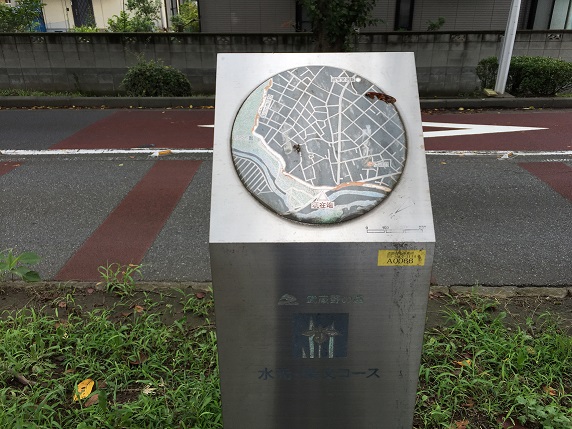 水門から大場川沿いに細い道路が延びています。一車線のみの遊歩道のような道路ですが、舗装してあるので車がビュンビュン通ります。桜並木が続いていますので、車が通らなかったら格好の散策路になると思うのですが。ちなみに、この道路には「水元さくら堤」という愛称が付けられています。暫くは大場川を左手に見ながら、後ろから疾走してくる車を気にしつつ歩きます。水元五丁目三差路の交差点を過ぎると道路は二手に分かれます。標識がないのでどちらに進むか迷います。左手に少し進んだところで、道路の反対側に見慣れた標識が見えました。交番の真ん前ですが、車が途切れているのを確かめて道路を横断します。三差路で右側の道に進むのが正解だったようです。10年前はどっちを歩いたのでしょうか?当時の写真を見てみますと、左手に進んで閘門橋まで行ったようです。あの時は日暮れ時で標識に気がつかなかったからなのでしょうか?