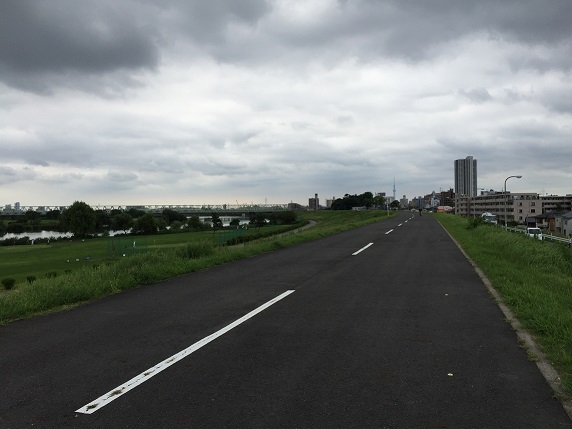 東金町五丁目交差点で水元公園とお別れして、そのまま真っ直ぐに進み、東金町七丁目交差点を渡ったところで江戸川の土手に出ます。さすがに江戸川は大河です。広大な河川敷はゴルフ場になっていて、どんよりとした空の下でゴルフを楽しんでいるグループが散見されます。ゴルフってそんなに面白いもんですかね?